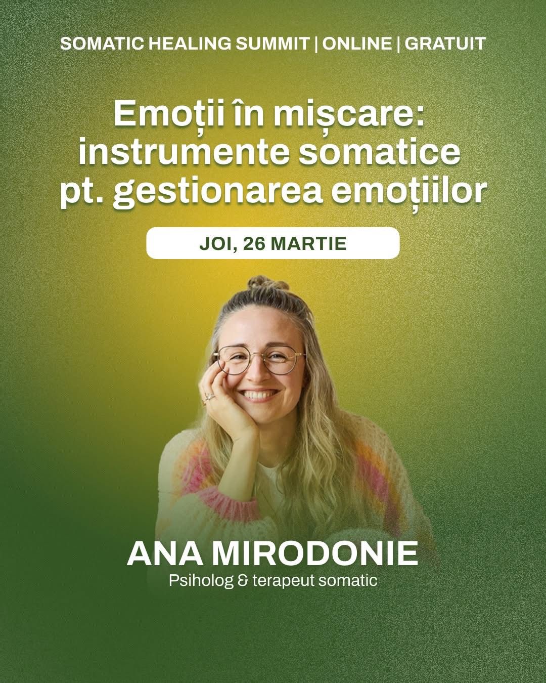 Eveniment de referință care aduce împreună specialiști internaționali pentru a discuta psihoterapii somatice (precum Somatic Experiencing® sau Psihoterapia Sensorimotorie), oferind acces gratuit la discuții despre reglarea sistemului nervos.